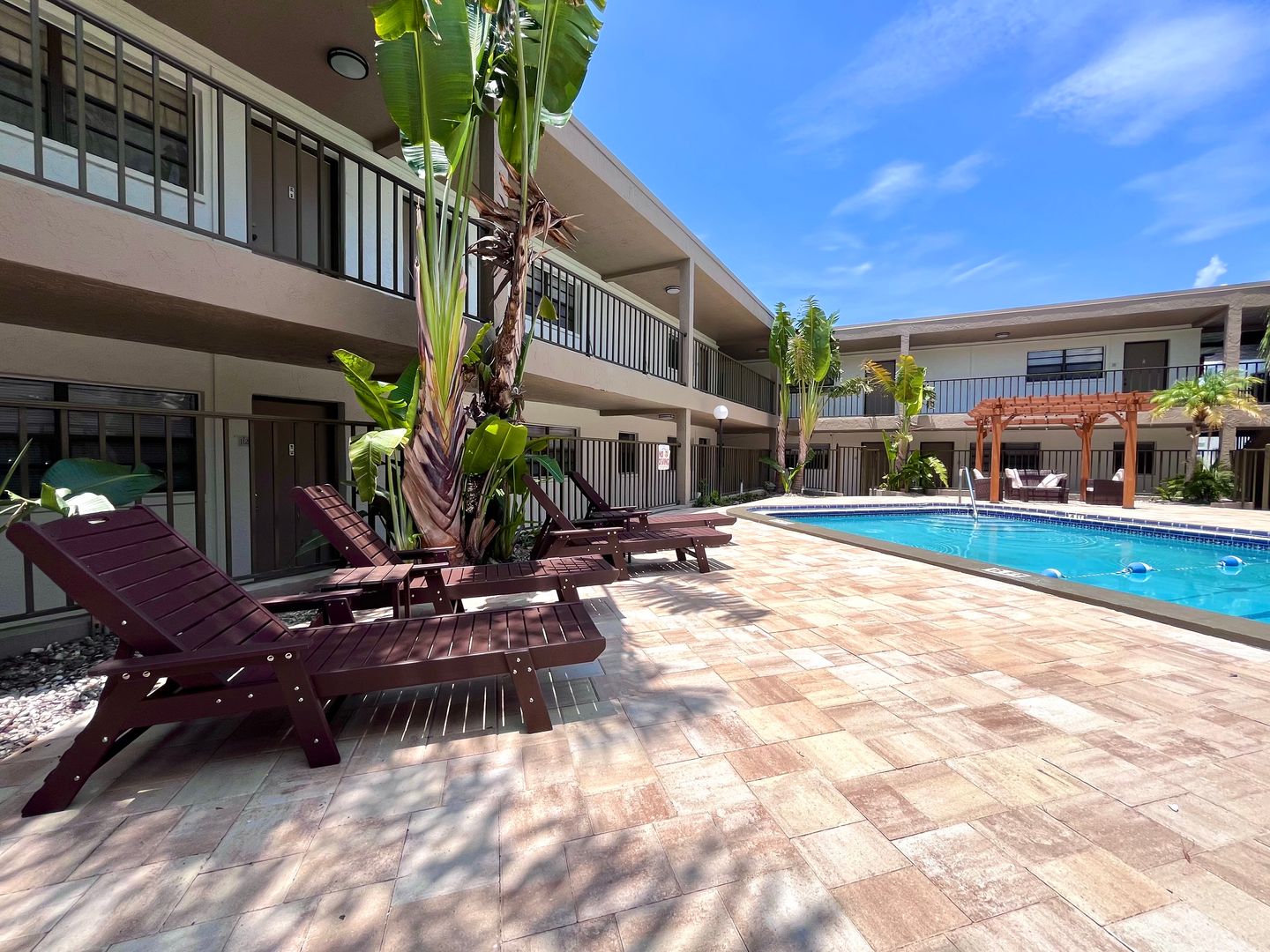 This upgraded apartment includes a 4-piece appliance package with a dishwasher, luxury vinyl plank flooring, and updated lighting. You'll enjoy the pool and lounge area under our beautiful pergola; and your pets will love our Dog Park!. There is off-street parking and a laundry facility on property.