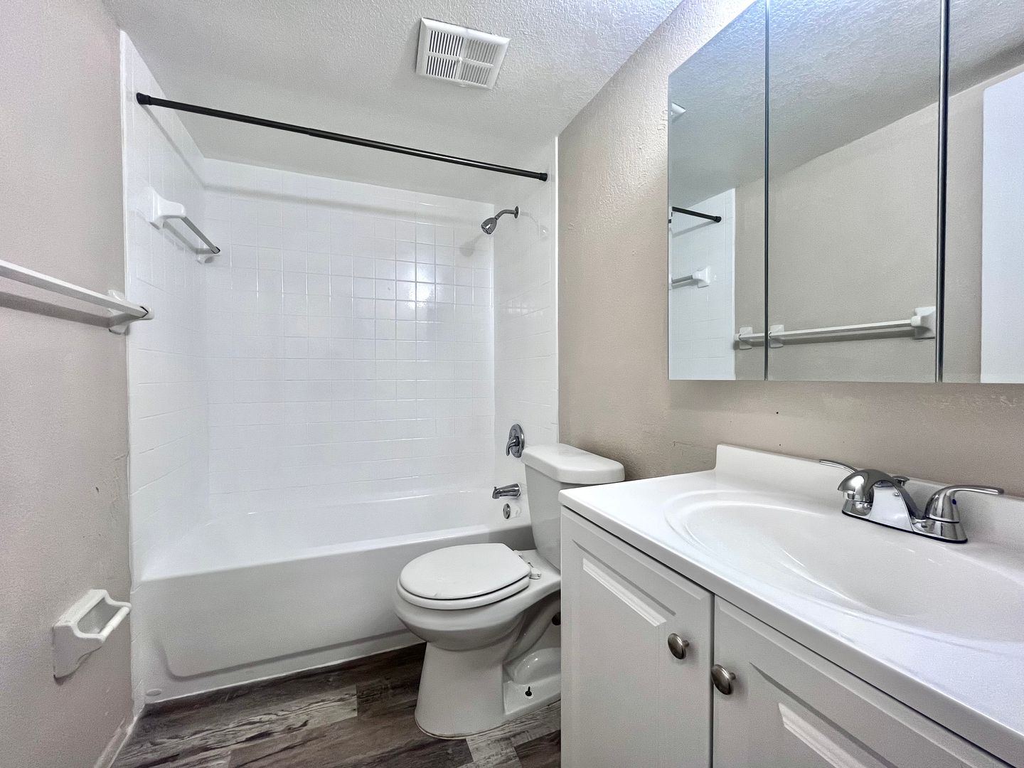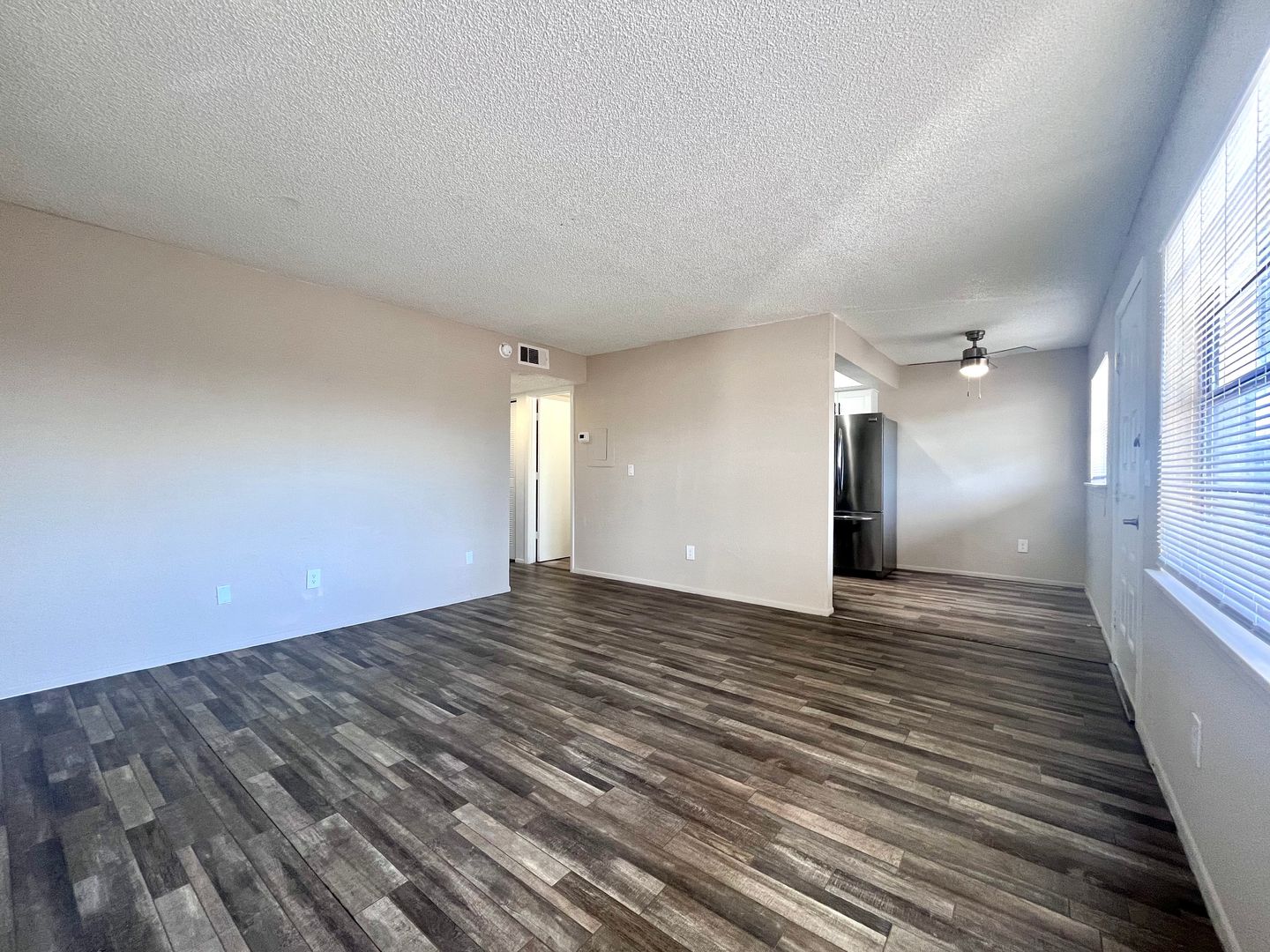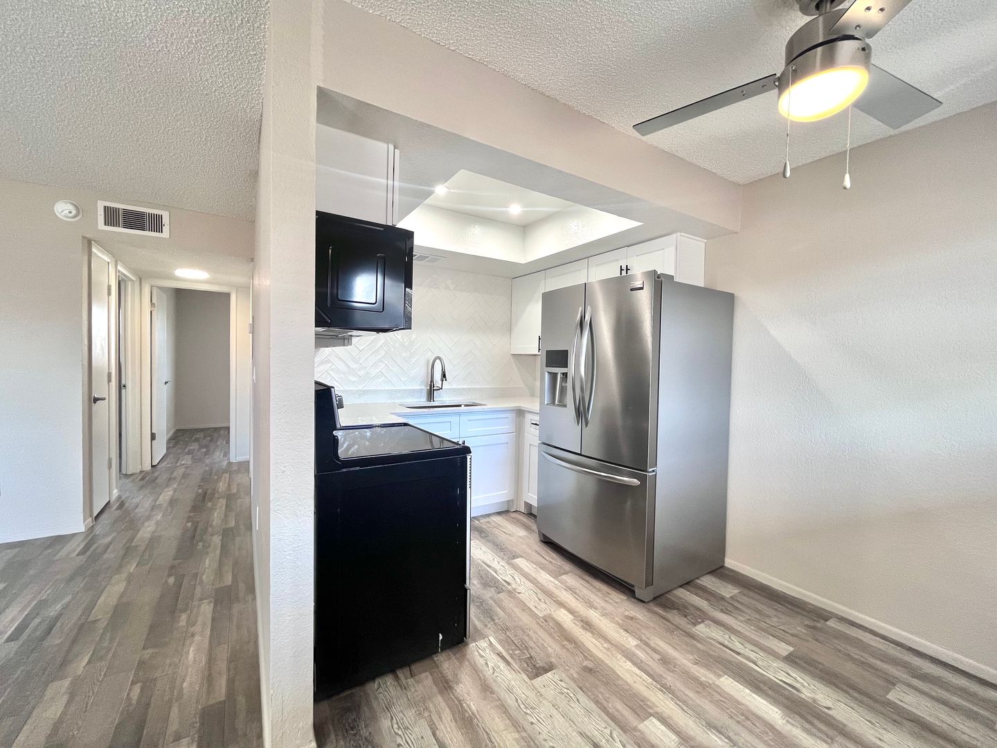 This upgraded apartment includes all new black appliances with an over-the-range microwave, plus renovated cabinets and countertops, luxury vinyl plank flooring, and updated lighting. There is designated parking in front of the apartment, and there is a laundry facility on property.